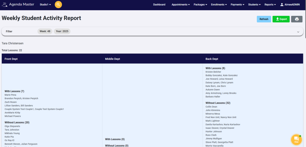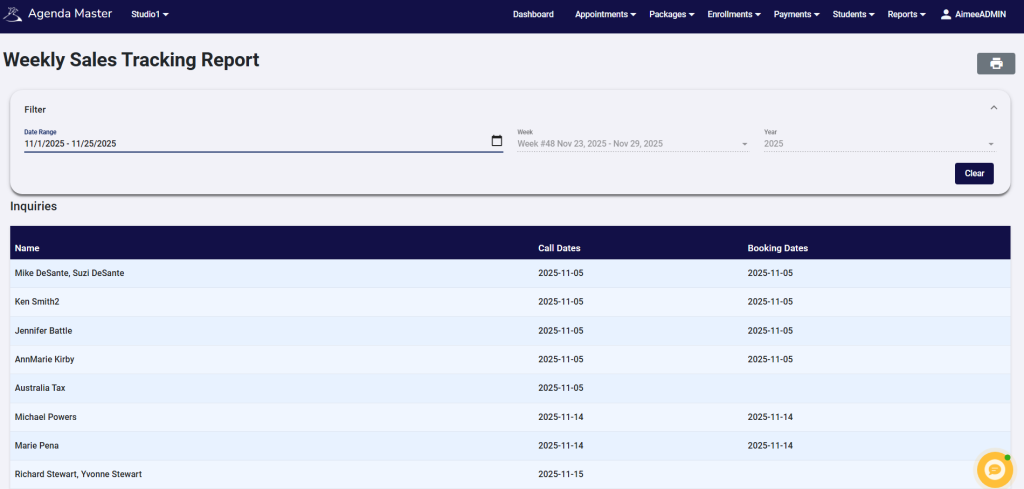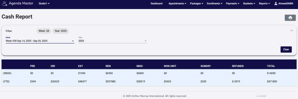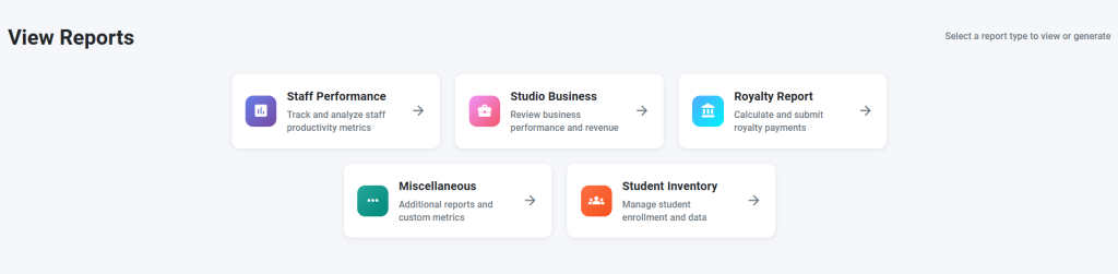 Here is where you will find the reports that need to be submitted to Arthur Murray International. There are the weekly reports; The Staff Performance Report, The Studio Business Report, and the Royalty Report. Along with the Miscellaneous Report and the Studio Inventory Report.