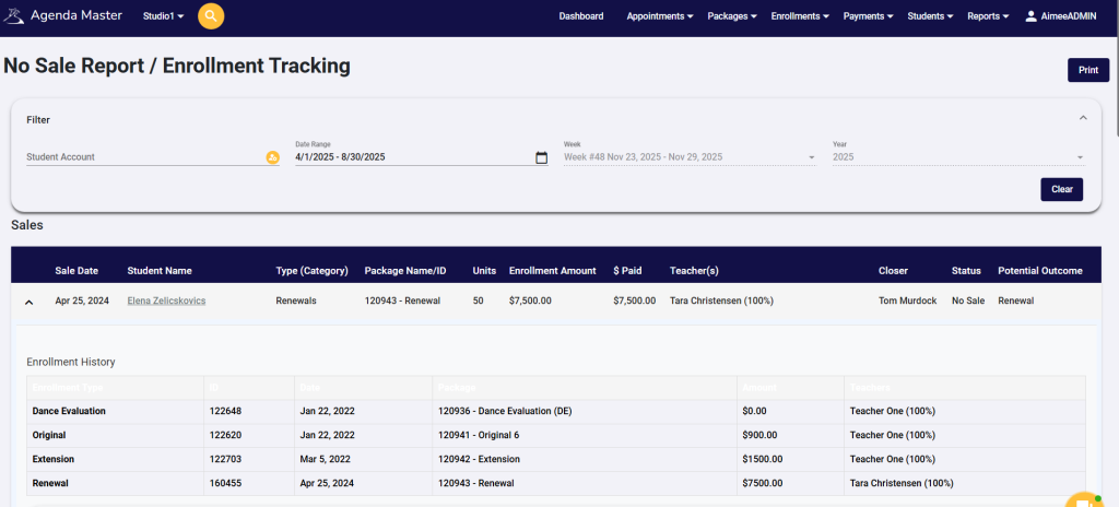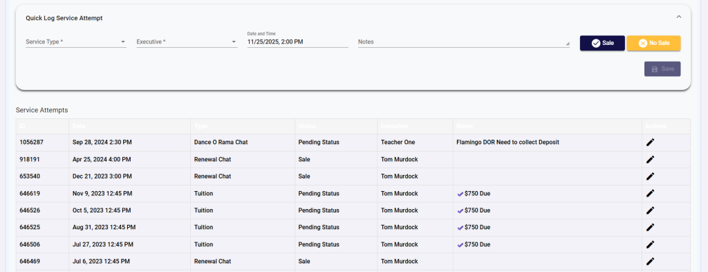 With this report report you are able to see a snap shot of a students Enrollment history, service attempts, as well as quickly log or edit a service attempt and enter any follow up notes for that sale/no sale. You can use the filter bar at the top to view by student account or date range.