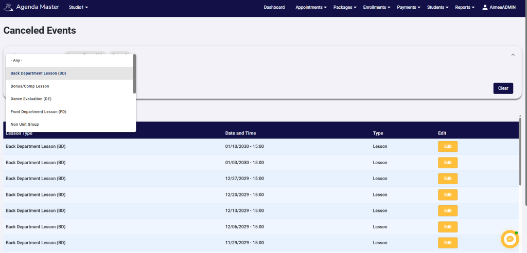 This report will show you all canceled events for a specified lesson type. Use the filter bar to select which lesson type you would like to view.