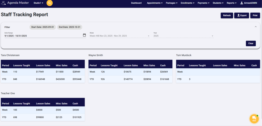 This report will allow you to view lessons taught, lesson sales, miscellaneous sales, and cash in for each instructor over a specified timeframe. Use the filter to select the date range you would like to view.