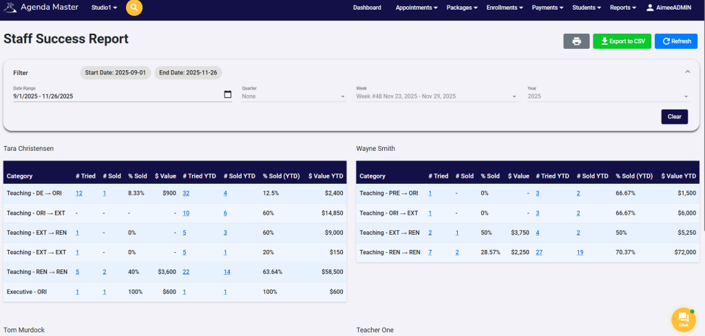 This report will allow you to view tried/sold/percentages for all categories for a specified timeframe as well as YTD for each instructor and executive.