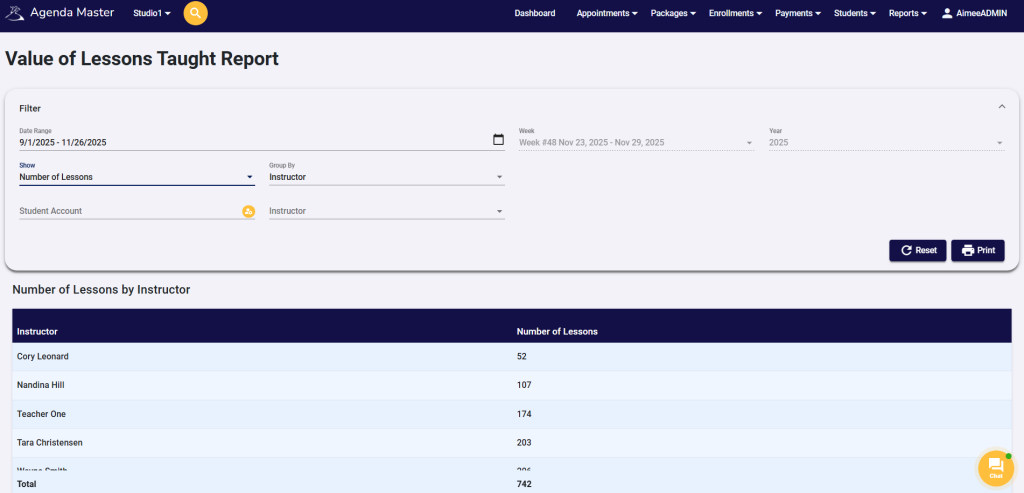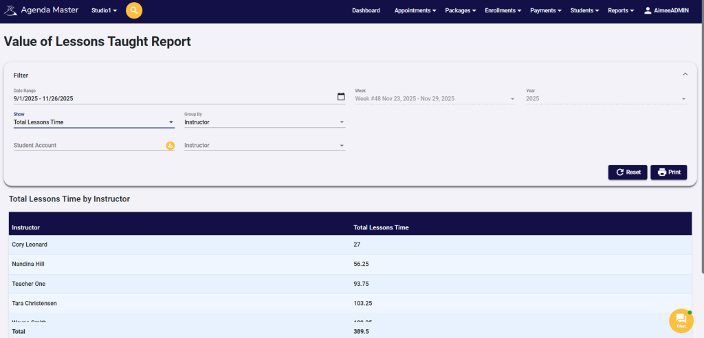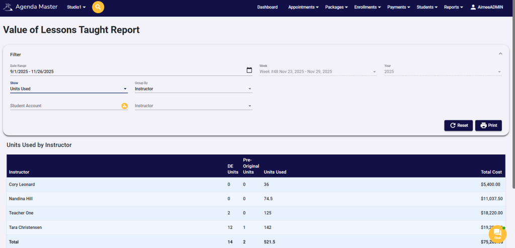 This report will allow you to view lessons taught by units used, number of lessons, or total lesson time for a selected date range. Use the filter to select your desired view.