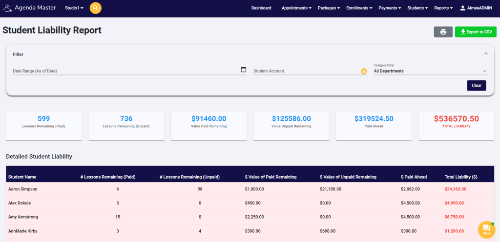 This report will show you lessons remaining and paid and lessons remaining and unpaid. It will allow you to view the total value of lessons paid ahead and well as your total liability for your selected time range. You will be able to view the liability for each individual student account, any account with a liability greater than $1,000 will appear in red.