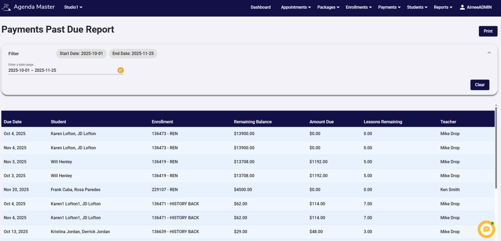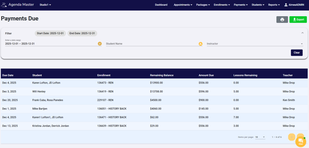 This report will show you upcoming Payments due, which Enrollment the payment is due on, what the remaining balance of the Enrollment is, and how many lessons remain on that Enrollment. The Payments can be filtered by date range, student name, or instructor.