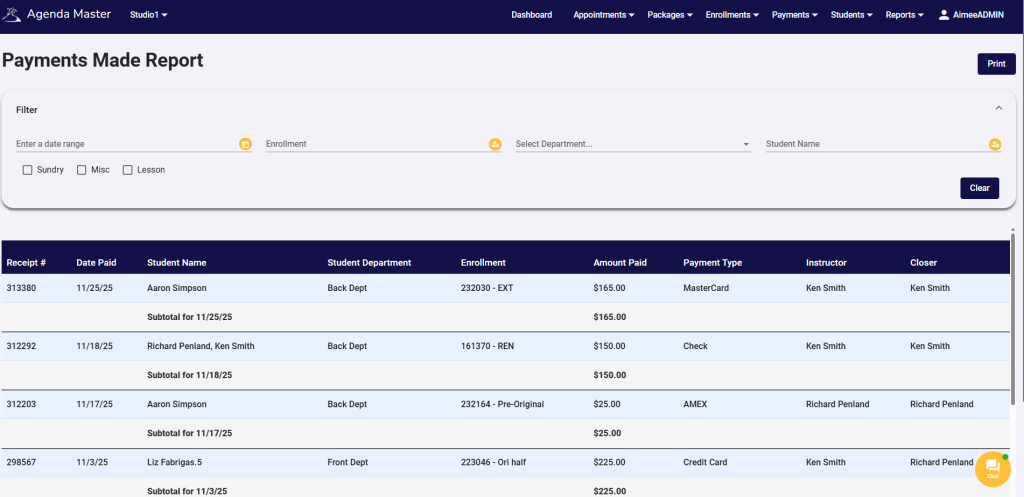 This report will allow you to see Payments made. You are able to filter by date range, Enrollment, department or student name. You can refine further by checking the boxes to see Sundry, Misc, or Lesson Payments.