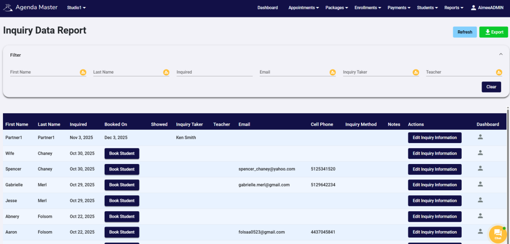 The Inquiry Data Report is where you can access and edit all inquiry information. There is a filter bar at the top that will allow you to refine your search. From this report you are able to see what date the inquiry is booked on, or directly book the inquiry from this report by selecting “Book Student”. This is also the place where you would edit any inquiry data. Select “Edit Inquiry Information” to adjust any personal information or add a partner.