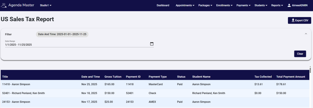 This report will show you the gross tuition broken down into tax collected and total payment amount. You are able to use the filter to select the date range you would like to view.